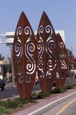 As in my 2D art, we focused on archetypal symbols inspired by the ancients - the circle and the vesica piscis. We worked with the students to choose 'power words' that are cut into the eight foot steel gate. The words - spirit, vision, wisdom, dream, honor and inspire - form the inner core while family, school, friendship and community enclose the center. The two stucco columns are embedded with broken tile mosaics created by the students that illustrate local history.